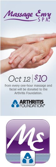 Join them as they help us raise awareness of this painful chronic disease! Book a therapeutic massage or facial at one of the Massage Envy clinics today, and for every one-hour session, $10 will be donated to the Arthritis Foundation. Additionally, Murad®, their exclusive skincare partner, will donate 10% of all sales of products sold at Massage Envy Spa locations during the event, while Wyndmere, their retail partner at all locations, will also donate 10% of all their retail sales on event day.