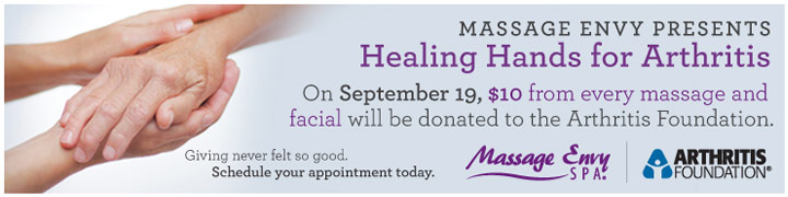 On September 19th, 2012, Massage Envy will donate $10 from every massage and facial to the Arthritis Foundation, as part of “Healing Hands for Arthritis.”