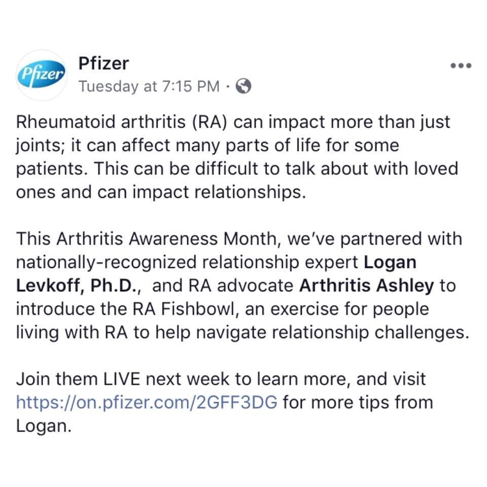 33776646_2161411003875514_592708192677396480_n Published May 28, 2018 at 960 × 960 in Pfizer & Arthritis Ashley Facebook Live: May 29 Next →